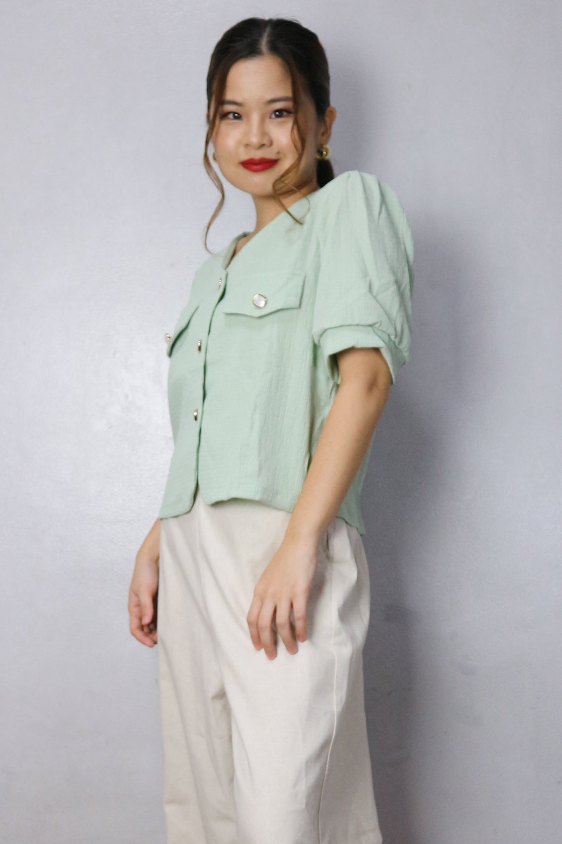 "These Mylene button-down tops are cute and dainty, perfect for pairing with any bottom. Dress them up or down for a versatile and stylish look. Add a touch of fun to your wardrobe with these tops!"